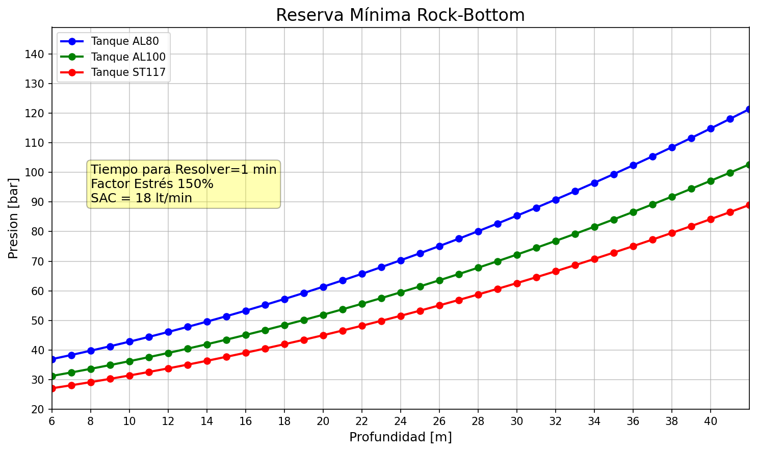 Dado lo anterior, para cada profundidad corresponderá una cantidad de gas mínima, que nunca debe rebasarse. Esto se puede resolver para cada profundidad en el rango del buceo recreativo y traducido a presiones mínimas para varios tanques comunes, para un fácil manejo bajo el agua.