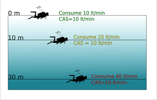 Sabemos que en todo momento nuestro consumo en la profundidad que nos encontremos será igual a nuestro consumo en superficie (SAC) afectado por un factor que amplifica el consumo de acuerdo con la profundidad que nos encontremos.( tal vez te interese repasar cómo afecta este factor el cálculo del SAC)